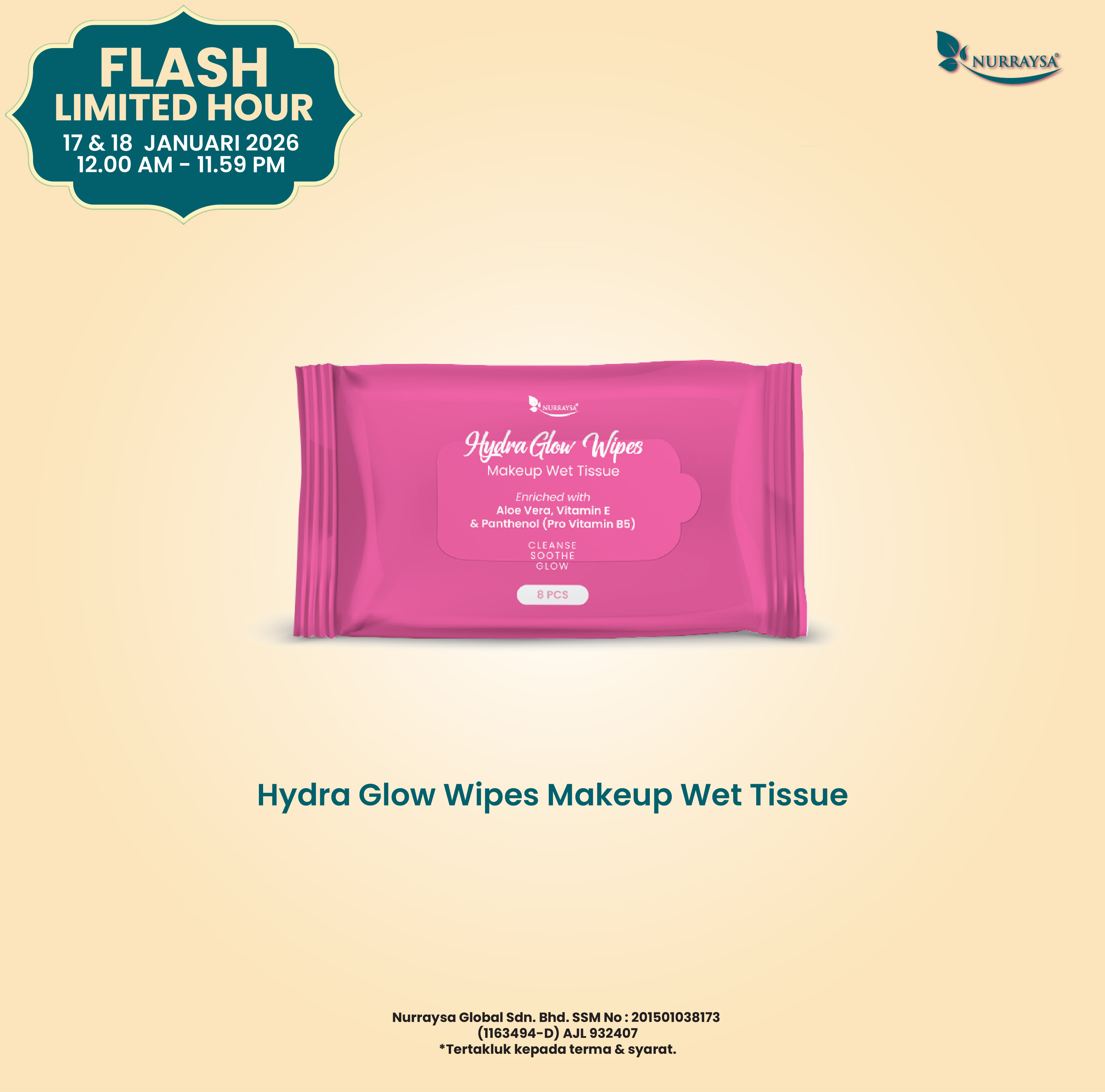 Flash Limited Hour 17-18 Januari : 5 Unit Hydra Glow Wipes MakeUp Wet Tissue