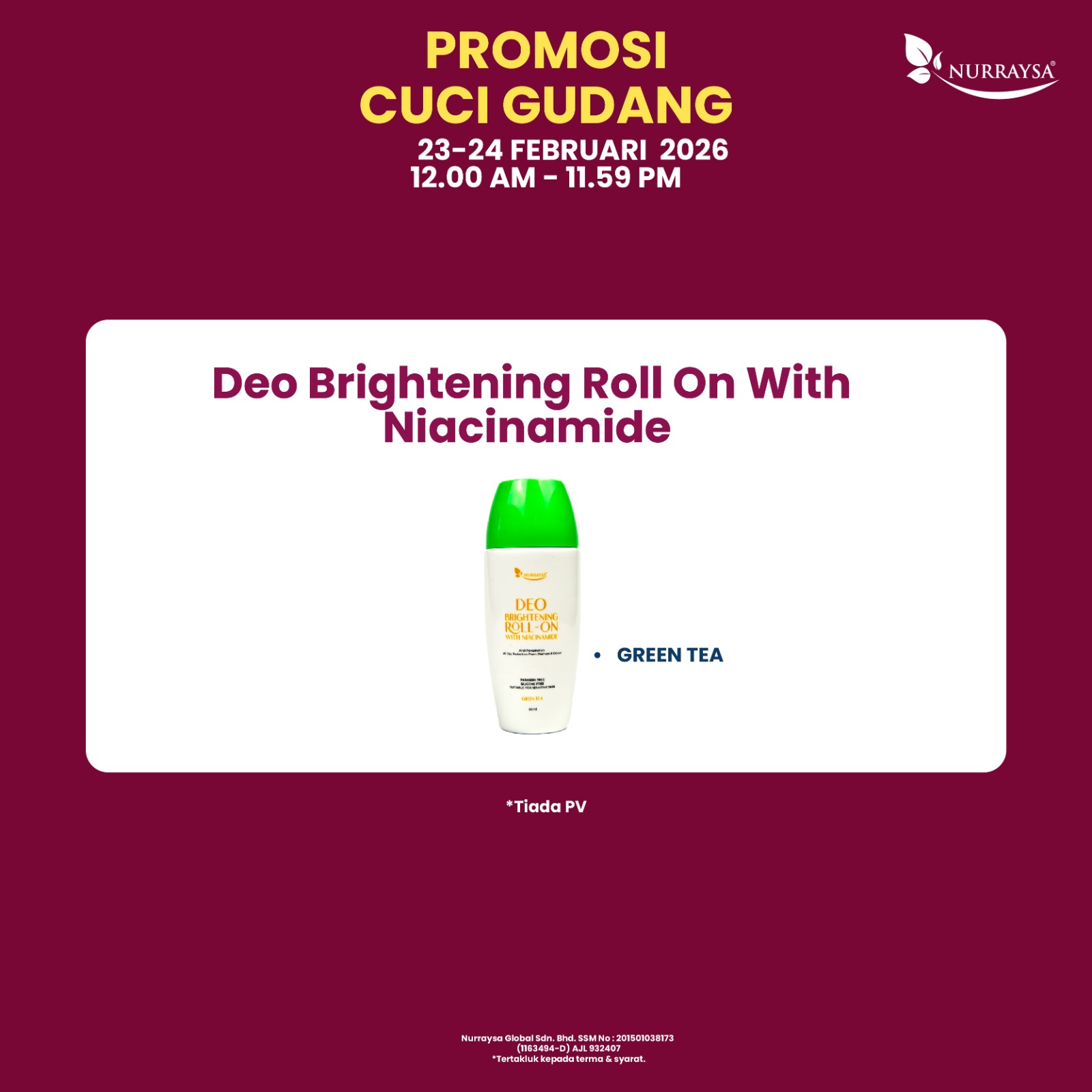 - • Deo Brightening Roll On with Niacinamide - Green Tea ~ Expired date: 01/08/2026 (MYR)
