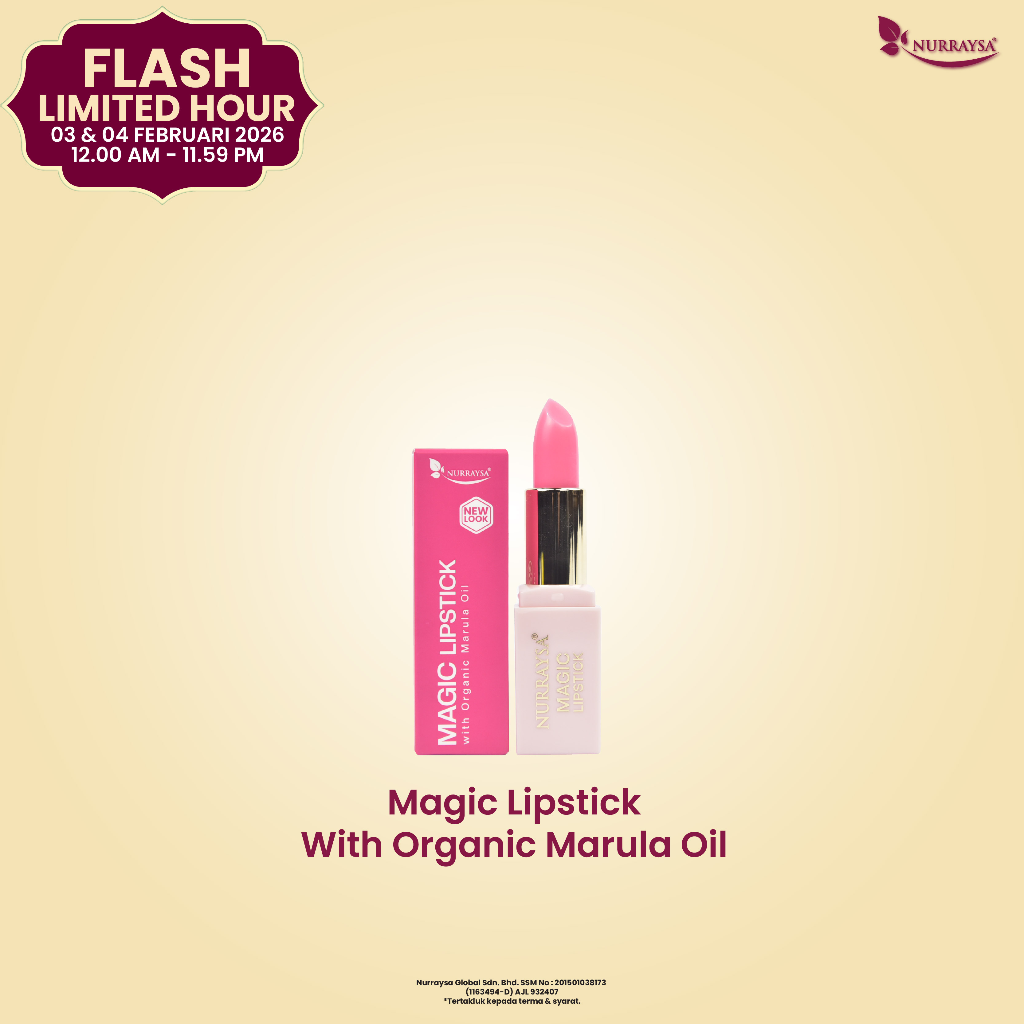 Flash Limited Hour 31 Disember : 1 Unit Magic Lipstick With Organic Marula Oil