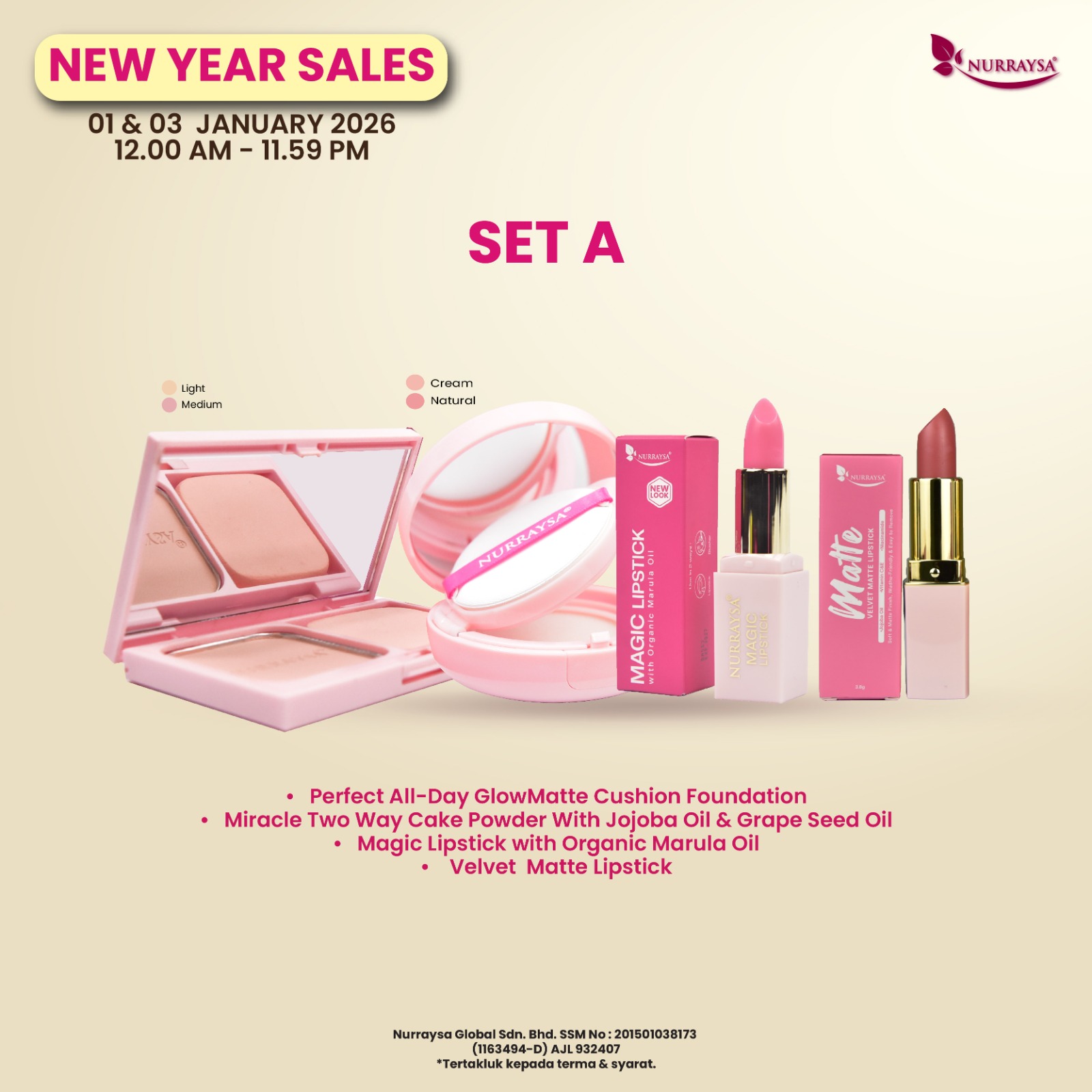 New Year Sales 01-03 January : Set A (Magic Lipstick+Cushion FD+Twcp+Velvet Matte)