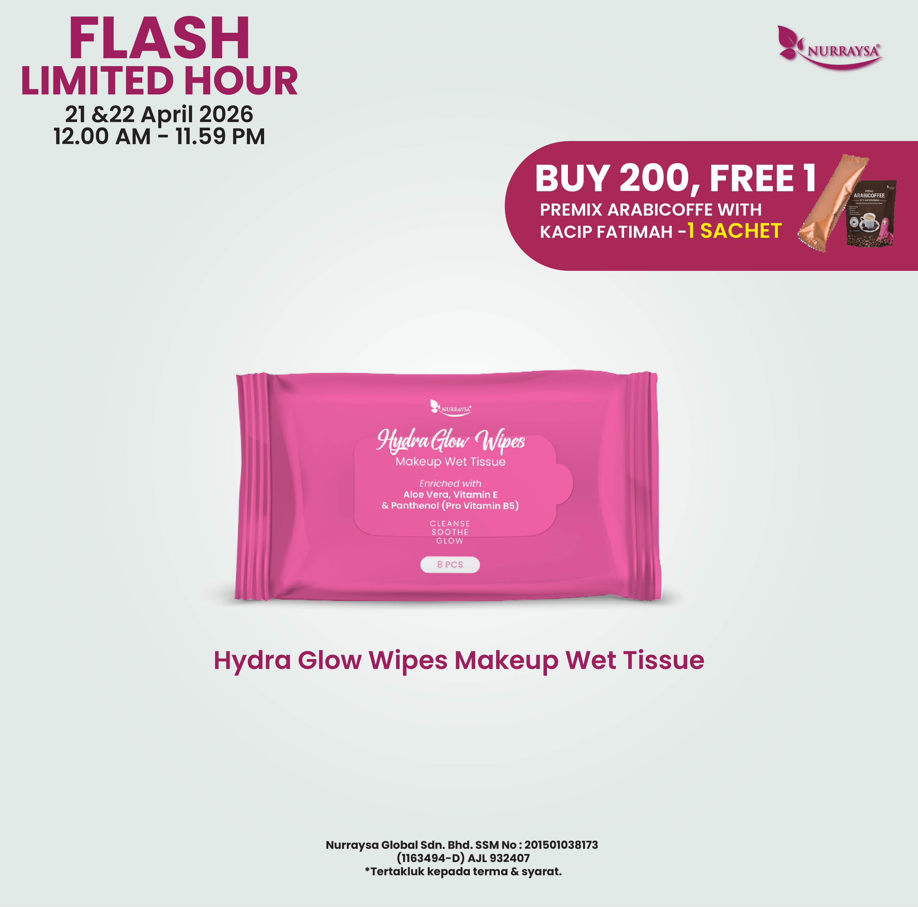 Flash Limited Hour 21-22 April : 200 Unit Hydra Glow Wipes MakeUp Wet Tissue