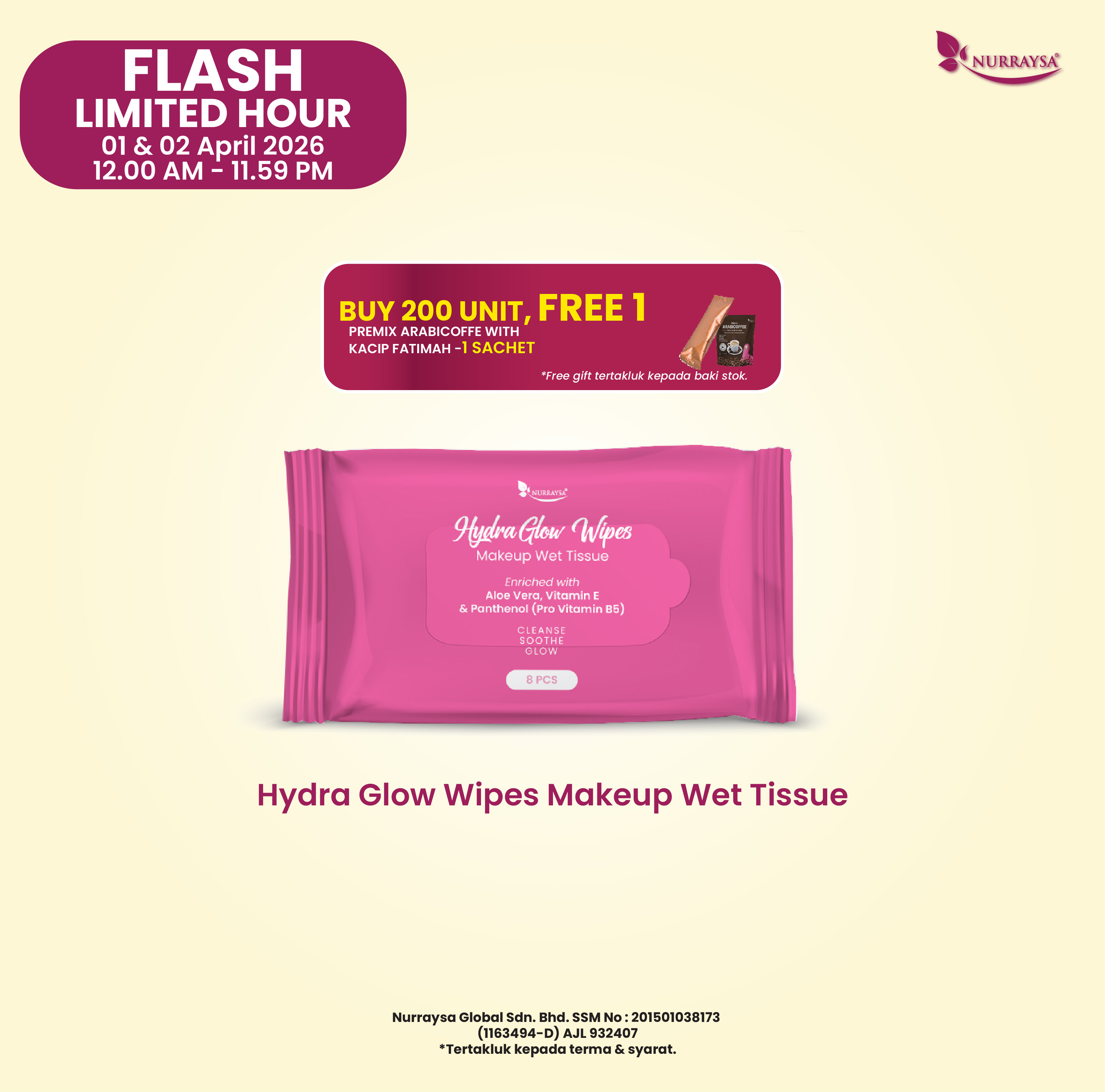 Flash Limited Hour 01-02 April : 200 Unit Hydra Glow Wipes MakeUp Wet Tissue