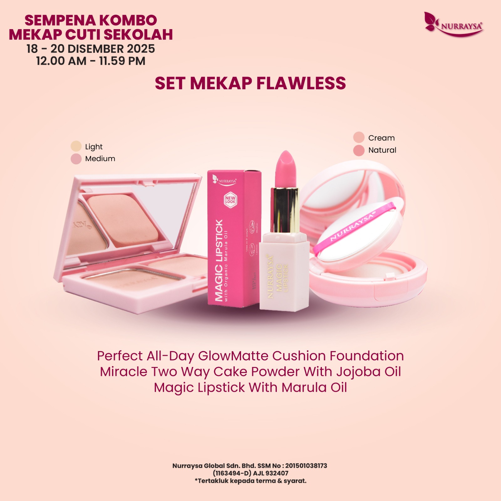 Kombo Mekap Cuti Sekolah 18-20 Disember : Set mekap Flawless (Cushion FD+Magic Lipstick+Twcp)
